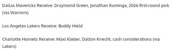 ESPN提出的交易框架具体交易方案如下:金州勇士队得到:安东尼·戴维斯、梅森·普拉姆利;达拉斯小牛队得到:德雷蒙德·格林、乔纳森·库明加、勇士队2026年首轮选秀权;洛杉矶湖人队得到:巴迪·希尔德;夏洛特黄蜂队得到:马克西·克莱伯、道尔顿·克内希特、湖人队提供的现金补偿。理论上,这是一笔充满话题性的交易方案,但现实层面的考量远比纸面分析复杂。